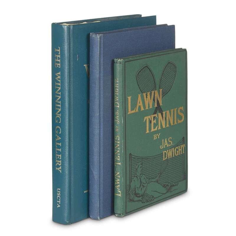 Dwight, James Lawn-Tennis London: "Pastime" Office, [1888]. First English edition. Small 8vo. 4 preliminary leaves, (1)-94 pp., 4 advertisement leaves. Original black-stamped pictorial and gilt-lettered green cloth. 12 line presentation to William J. Clothier [II] inscribed, dated "December, 1982," and signed by Richard W. Dwight [the author's son] in ink on front free endpaper recto. Danzig, Allison The Winning Gallery: Court Tennis Matches and Memories Philadelphia: United States Court Tennis Association, (1985). 8vo. Original green leather, gilt. With 8 line dedication to Bill [William J.] Clothier [II] inscribed, dated "Dec. 15, 1985," and signed by Allison Danzig in ink on front free endpaper recto. Fenno, J. Brooks; Gordon, Lewis H. International Intercollegiate Tennis, 1921-1974, Harvard-Yale versus Oxford-Cambridge, A Chronicle of Prentice Cup and prior matches No place: The Prentice Cup Committees, [1975]. 8vo. Original blue cloth, gilt. Presentation copy to Bill [William J.] Clothier [II] inscribed and signed by J. Brooks Fenno and Lewis H. Gordon in ink on front free endpaper recto, also dated in ink "1975" by Fenno.