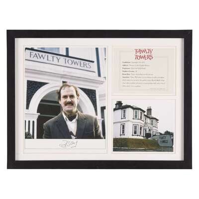 Color screen photo of John Cleese (head and upper torso) in front of Fawlty Towers. Signed in ink below image. Framed with another photo and printed pieces relating to Fawlty Towers.