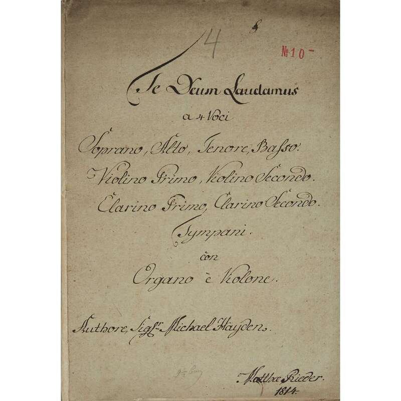 [Composed 1760, 4vv, orch.]. Manuscript prepared for kapellmeister [Ambrose] Matthaeus Rieder, 1814: " Te Deum Laudamus / a 4 Voci / Soprano, Alto, Tenore, Basso. / Violino Primo, Violino Secondo. / Clarino Primo, Clarino Secondo. / Tympani. / con. Organo e Violone. / Authore, Sig... Michael Hayden. / Matthae Rieder. / 1814." Complete. New Grove, Volume 8, p. 410, kl V/1; Sherman & Thomas, A Complete Chronological Thematic Catalogue no. 28.