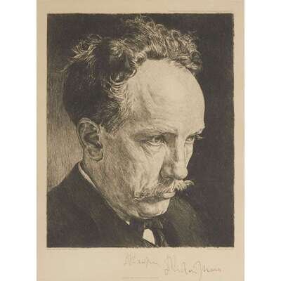 Berlin, 1905. Etched bust portrait of Richard Strauss by O. Felsing after J. Farago. Etched and autograph signatures below image. Etching clean, autograph signature clear and strong. Framed.