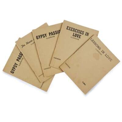 Havana, Cuba, ca. 1950s. Each 16mo. Original printed stapled tan wrappers. Each with a full-page explicit half-tone photo. Each 32 pp. Includes: Exercises in Love Gypsy Passion (two copies) The House of Beauty Lessons in Love.