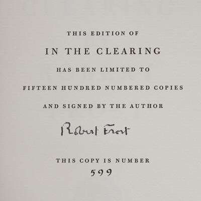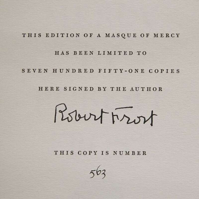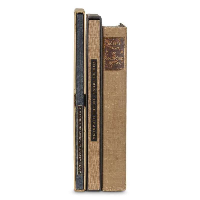 Collected Poems New York: Random House, 1930. First edition, #776/1,000 signed by Robert Frost on half-title. 8vo. Original light tan linen, brown leather spine label, top edge gilt, other edges untrimmed. Crane A14. A Masque of Mercy New York: Henry Holt, (1947). First edition, #563/751 copies signed by Robert Frost. 4to. Original blue cloth-backed, gilt-lined beige boards, gilt-lettered spine, front cover leather labels, original slip case. Crane A31. In the Clearing New York: Holt, Rinehart, and Winston (1962). First edition, #599/1,500 signed by Robert Frost. 8vo. Original brown linen, gilt-lettered black spine label, original slip case. Crane A41.