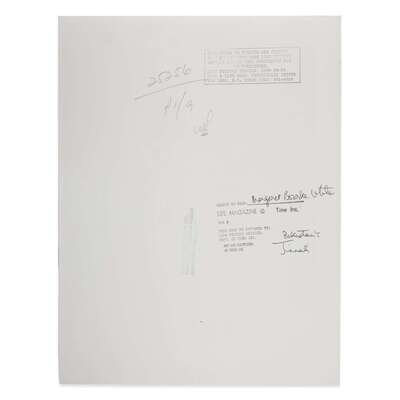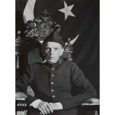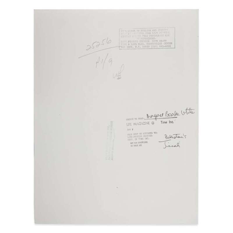 Gelatin silver print, printed 1960s. Portrait of Pakistan's founder, Muhammad Ali Jinnah (1876-1948). Multiple Time Inc. and Life Magazine stamps to verso as well as assorted notes in both ink and pencil. Stamps to verso utilize zip codes so they date to post-1963. In its original mailing envelope from Time Incorporated addressed to the American Museum of Natural History and noted in pencil: "Photo of Ali Jinnah for case #79 possibly" in an unknown hand. Clues from the envelope and the presence of zip codes lead us to assume the image was printed in the 1960s. .