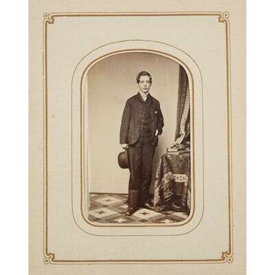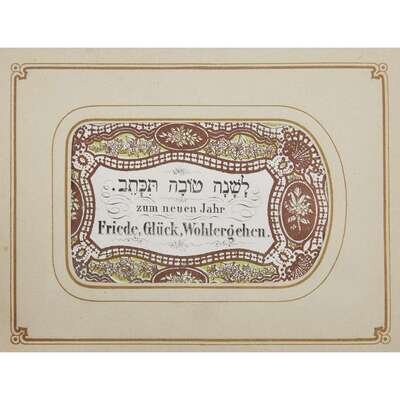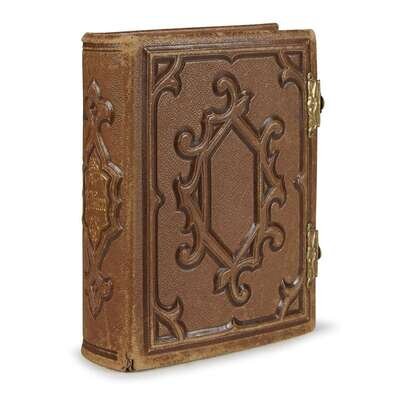 Germany (?) ca. 1870. Original embossed brown morocco, gilt-lettered spine, all edges gilt, ornamental brass clasps. Holding 35 primarily carte-de-visite format photo portraits, a few tintypes, and a Jewish New Year's card in Hebrew and German. Apparently depicting the members - children and adults - of a haute bourgeoisie 19th century German-Jewish family.