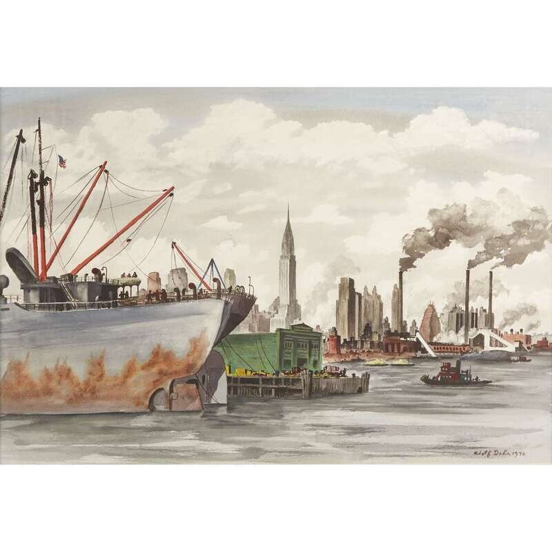 [Original Art] Dehn, Adolf Arthur (American, 1895-1968) East River Looking North from East River Drive at 18th Street
