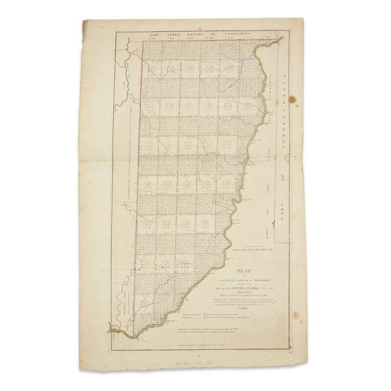 Engraved map with outline color. "Plat of the Seven Ranges of Townships being Part of the Territory of the United States N.W. of the River Ohio which by a late act of Congress are directed to be sold." [Philadelphia], [1796]. Presumed original hand outline color. Wheat and Burn 676, first state, without the publisher's imprint below the neat line at bottom.