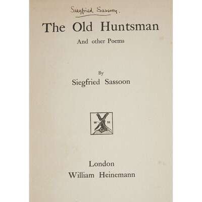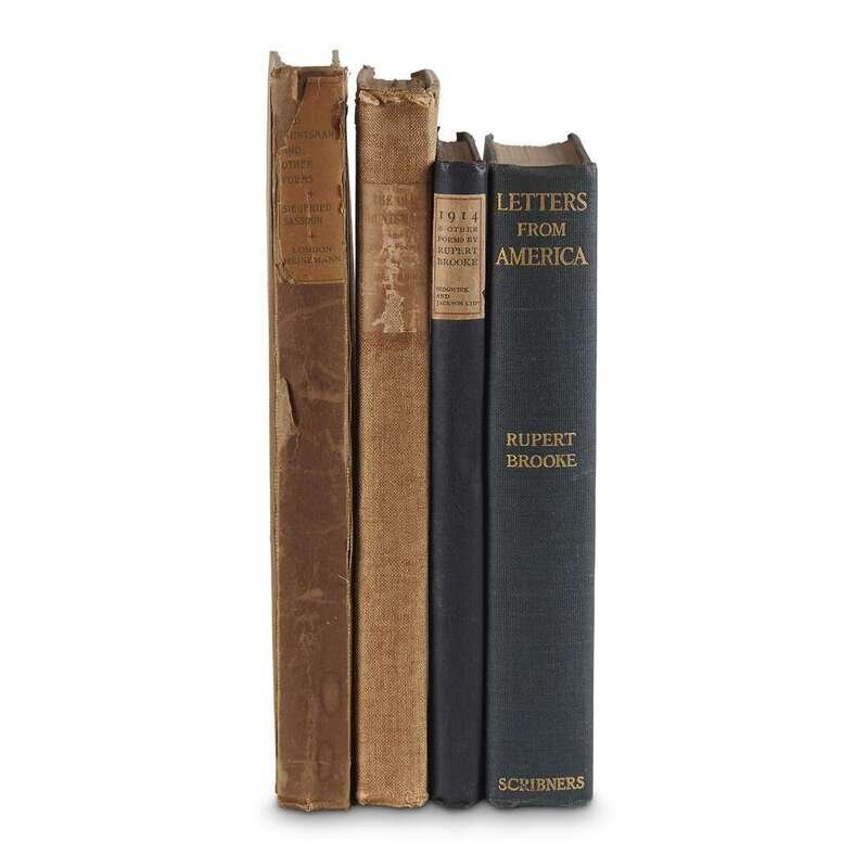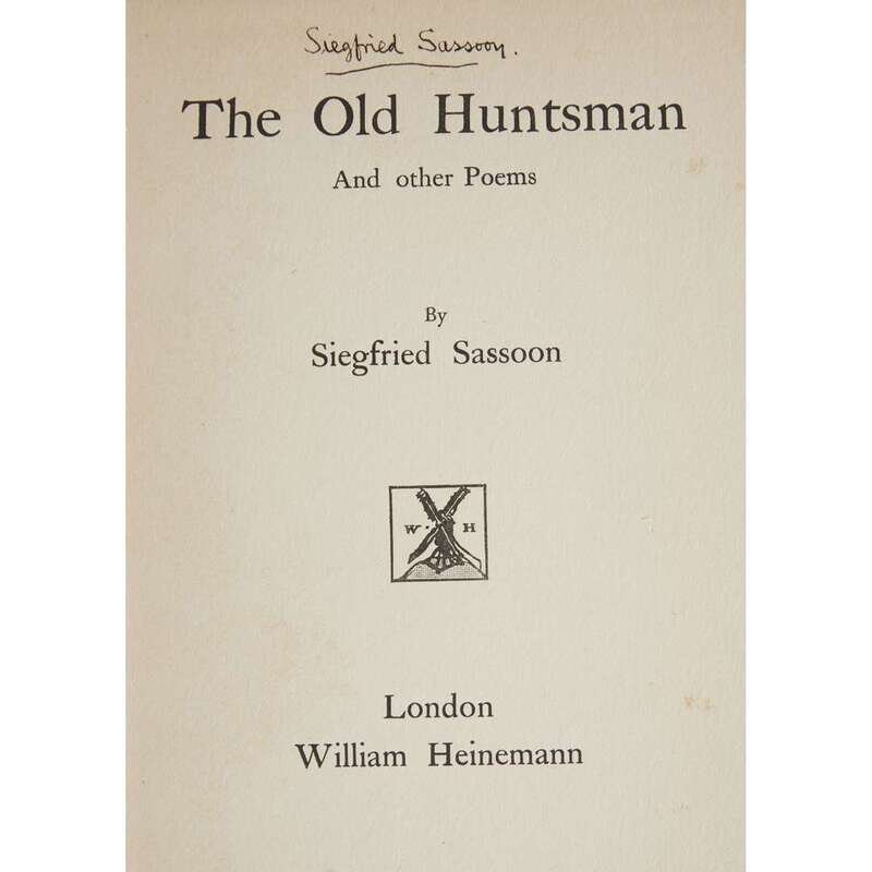 Brooke, Rupert 1914 and other Poems London: Sidgwick & Jackson, 1915. First edition. 1/1,000 copies. Small 8vo. Original black cloth, paper spine label. Keynes 6. Brooke, Rupert Letters from America New York: Scribner's, 1916. First American edition. 12mo. Original gilt-lettered dark green cloth. Sassoon, Siegfried The Old Huntsman London: William Heinemann, (1917). First edition. 8vo. Oringal gray boards, paper spine label. Signed by Siegfried Sassoon at head of title-page. Keynes A15. The New American 1918 edition of the preceding. 8vo. Original cloth backed gray boards.