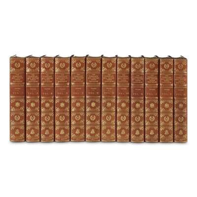 London: Chatto & Windus, 1893-1894. 8vo. Contemporary or near-contemporary three-quarter crushed, gilt-ruled purple morocco and marbled boards, emblematic gilt spine compartments, top edge gilt, by Bayntun. Issued with 36 steel engravings, extra-illustrated with 120 plates - primarily engravings, 12 in color. In twelve volumes.
