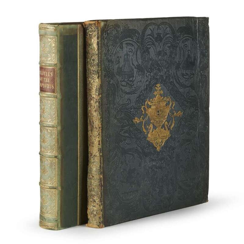Crane, John Syria, The Holy Land, Asia Minor, &c. London, Paris, New York: Fisher, Son, & Co., [1837]. Second Series only. 4to. Original gilt-pictorial and richly blind stamped green cloth, all edges gilt. Illustrated by W.H. Bartlett and William Purser. With additional engraved vignette title and 36 steel-engraved views. Pardoe, Miss The Beauties of the Bosphorus... Illustrated in a Series of Views of Constantinople and Its Environs London: Virtue, [ca. 1839]. 4to. Contemporary half green morocco and cloth, gilt, richly gilt spine compartments, morocco spine label, all edges gilt. Illustrated by W. H. Bartlett. With 2 engraved portraits, additional engraved vignette title and 83 steel-engraved views.