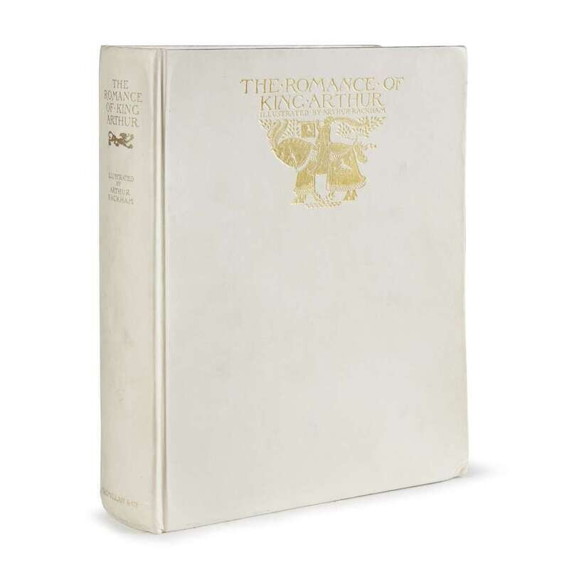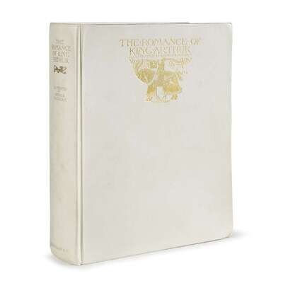 London: Macmillan, 1917. #425/500 signed by Arthur Rackham. Abridged from Malory's Morte D'Arthur by Alfred W. Pollard. 4to. Original gilt-pictorial and gilt-lettered white vellum over boards, top edge gilt, other edges untrimmed. With 16 mounted color plates, lettered tissue guards, and 7 uncolored plates, other plain illustrations and decorated initials. Latimore & Haskell p. 47.