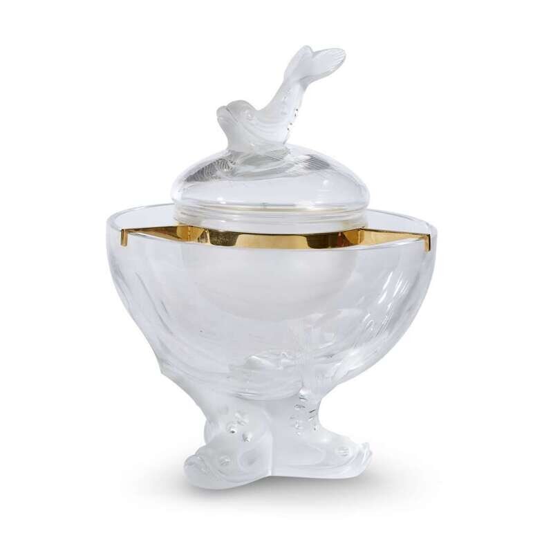 Lidded bowl with dolphin finial supported by a metal frame in open bowl with tripod dolphin form base, marked to underside. .