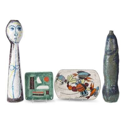 Including two tall bottle jars with figural decoration, a square Gambone plate, and an Italian platter. (4).