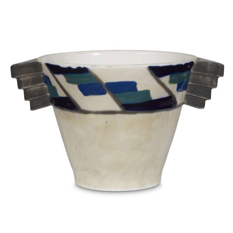 Flared form with stepped handles having a cream ground decorated with blue, green and grey glaze.