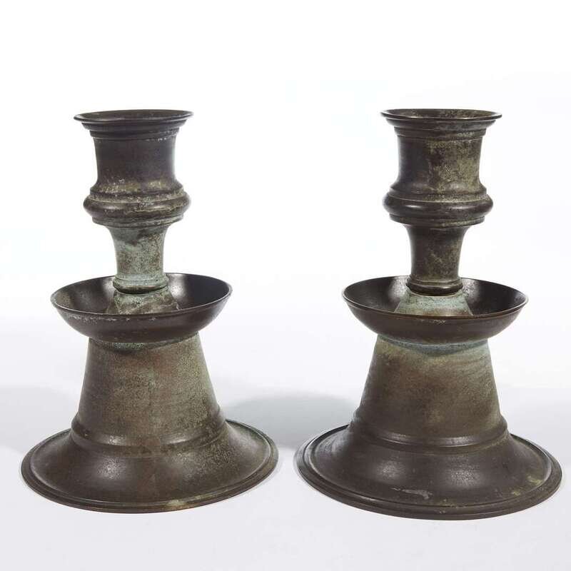 A pair of Islamic style metal candlesticks