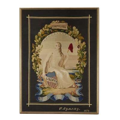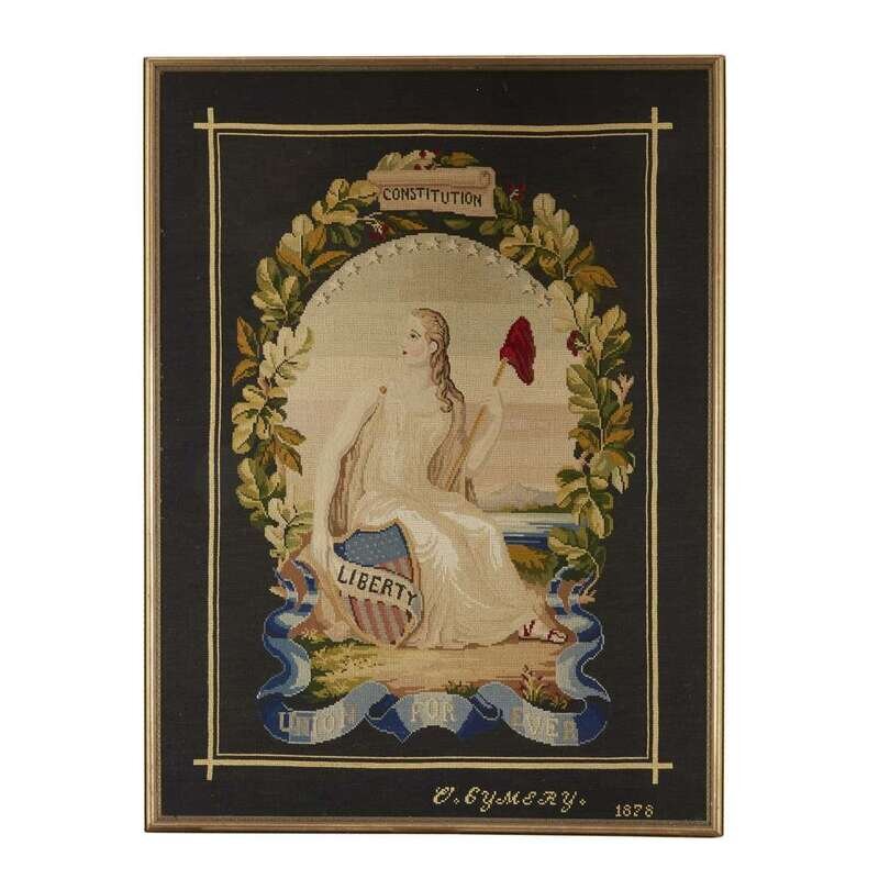 A Centennial needlework of seated Lady Liberty Signed and dated, "O. Cymery 1878"