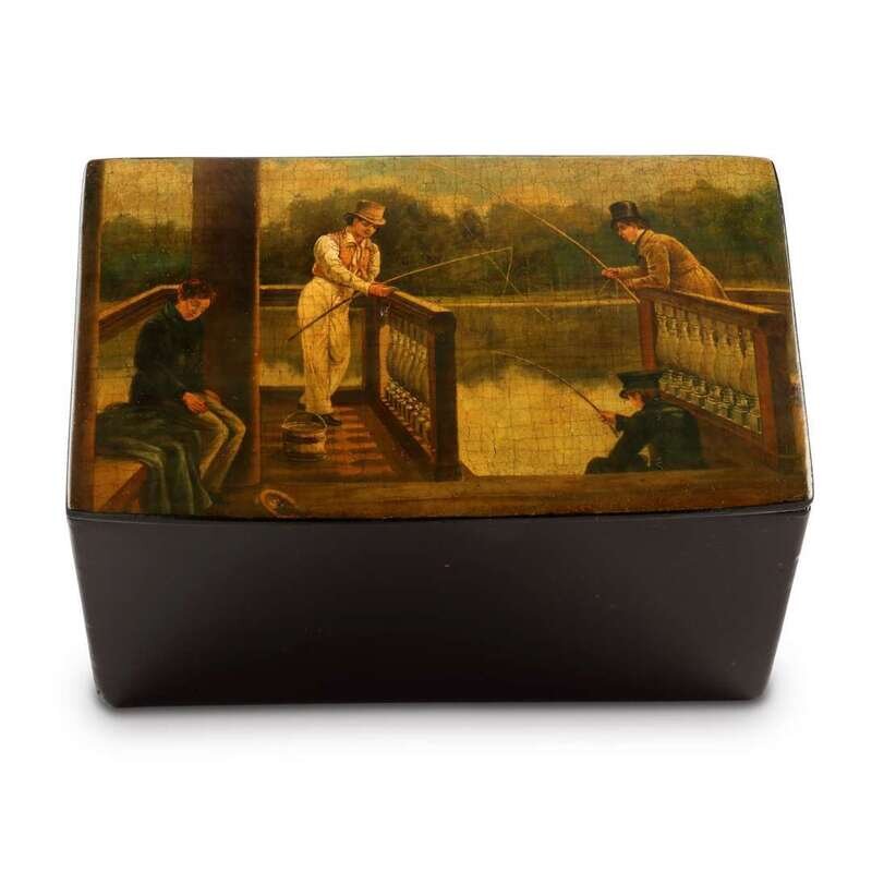 A Russian Lacquer Box "Schoolboys Fishing" Vishnyakov Factory, circa 1880