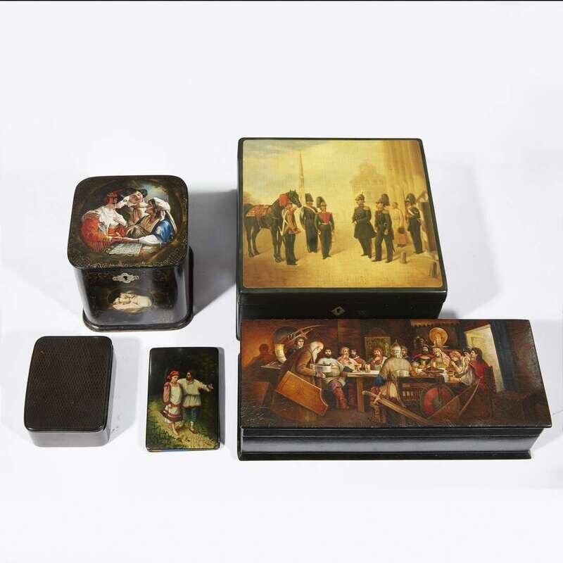 A group of five Russian lacquer objects Lukutin Factory, most 19th century