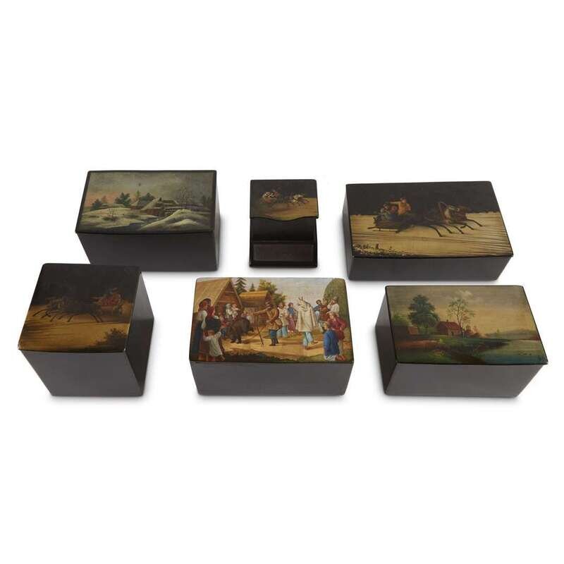 A group of six Russian lacquer boxes Vishnyakov Factory, last quarter 19th century