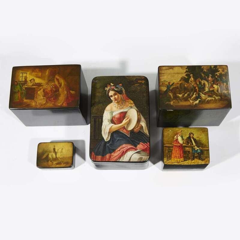 A group of five Russian lacquer boxes Vishnyakov Factory, late 19th/ early 20th century