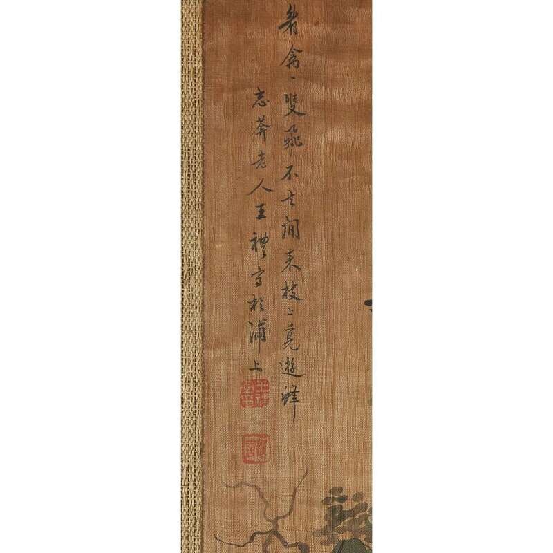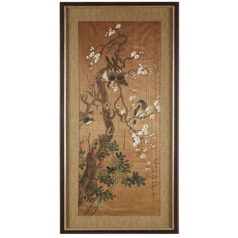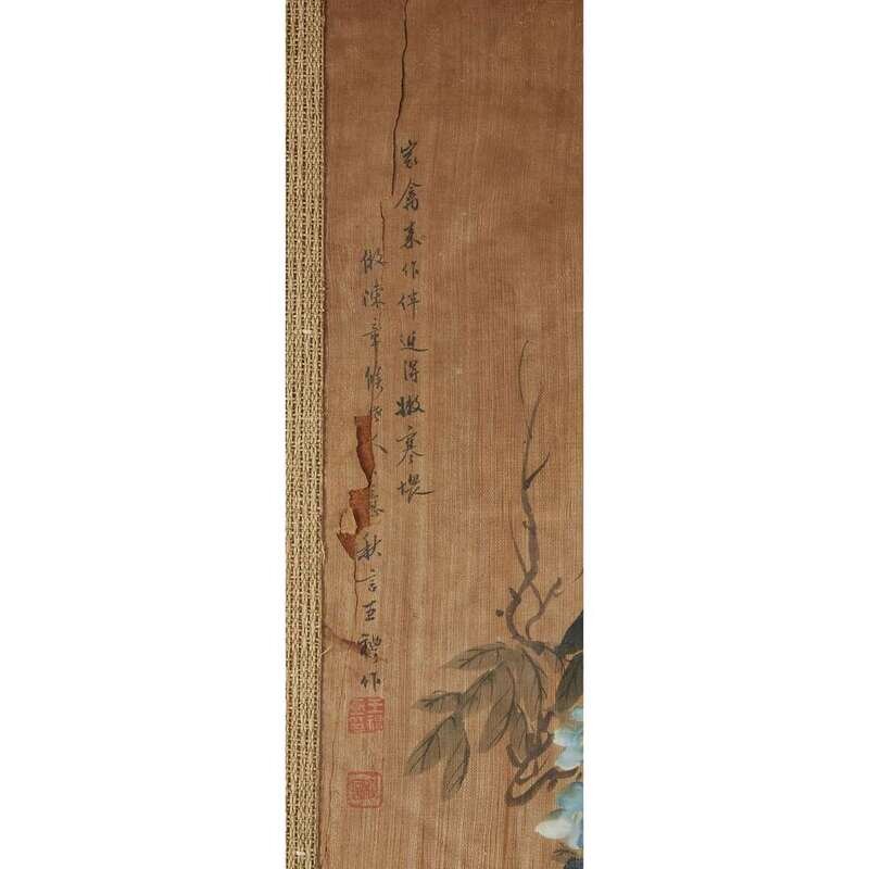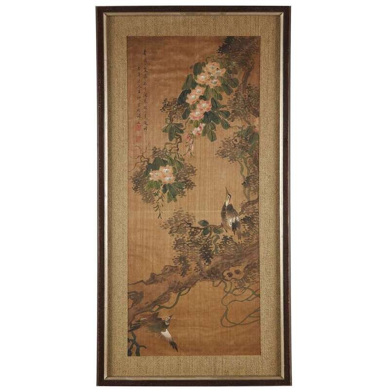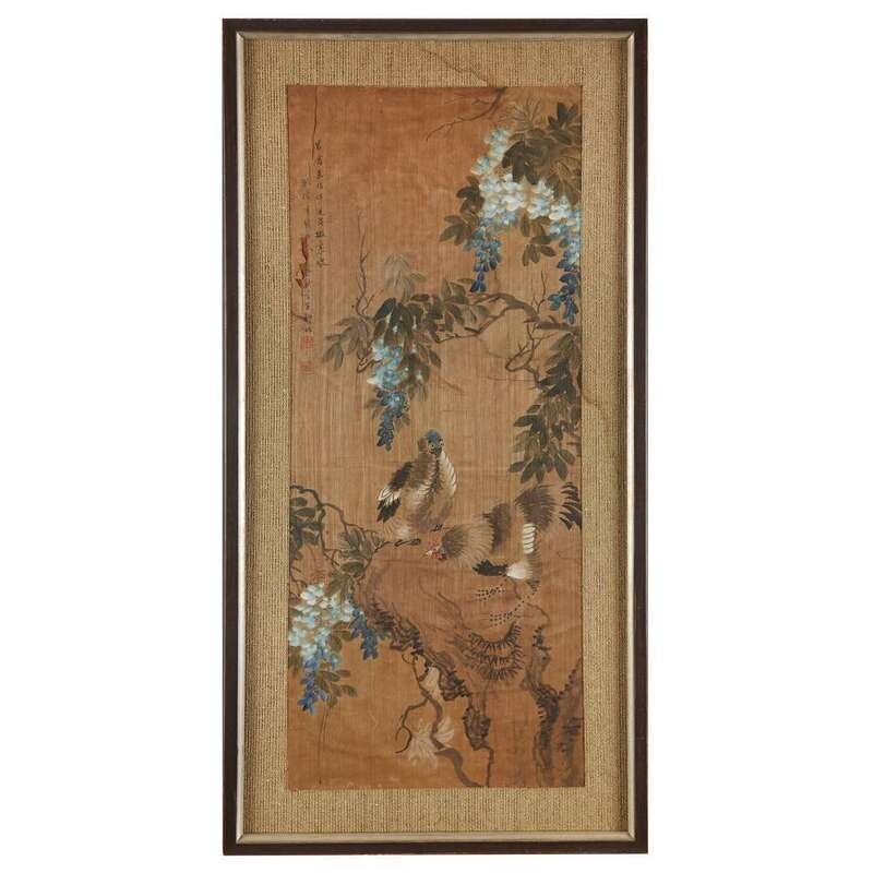 Ink and color on paper-backed silk, each inscribed and with two seals. framed matted and glazed. sight H: 34 in., 86.3cm; W: 14 1/4 in., 36.1cm