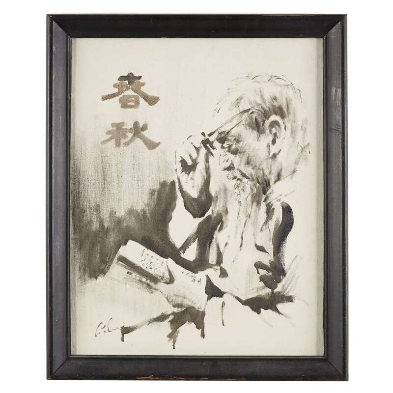 Wash on canvas Depicting a mature man reading, holding glasses, inscribed "Chunqiu" to upper left, indistinctly signed to lower left, framed. sight H: 19 1/2in., 49.5cm; W: 15 1/2 in., 35.3cm