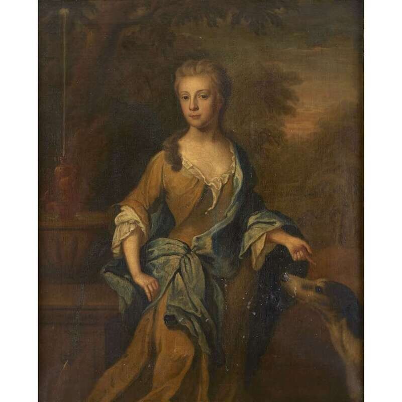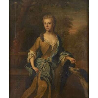 ATTRIBUTED TO JONATHAN RICHARDSON (BRITISH C. 1665-1745) PORTRAIT OF A LADY, THREE-QUARTER LENGTH, SAID TO BE ELIZABETH D'AVENANT, DAUGHTER OF THOMAS BOOTHBY, ESQR., WITH HER DOG