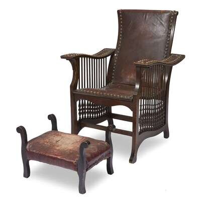 An Aesthetic Movement oak and leather armchair and footstool circa 1900