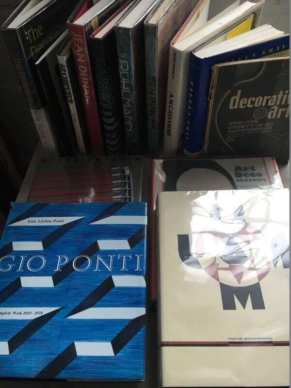 Incl. titles such as, Donald Deskey, David A. Hanks, Jennifer Toher, Dutton; Art Deco Furniture, Alastair Duncan, T&H; The Weber and the Moderne, Von Breton, UCSB; Art Deco Graphics, Kery, Abrams; A. M. Cassandre, Henri Mouron, Rizzoli; La Ceramique Art Deco, Edgar Pelichet, Bibliotheque des Arts; The Decorative Arts in France 1900-1942, Brunhammer Tise, Rizzoli; Jean-Michel Frank, Editions du Regard; Ruhlmann, Florence Camard, Abrams; Rene Herbst, Solange Goguel, Editions du Regard. Jean Dunand, Felix Marcilhac, Abrams; Decorative Arts, Golden Gate International Exposition Catalogue; Jean Dunand, Delorenzo Gallery; Archipenko, Karshan, Smithsonian; Le Style 1925, Baschet; Eileen Gray, J. Stewart Johnson, Museum of Modern Art; Eileen Gray, Abrams; Gio Ponti, Lisa Licitra Ponti, MIT Press; Union des Artistes Modernes, Union des Artistes Modernes, Editions du Regard. Approximately 20 items.