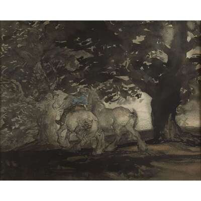EDMUND BLAMPIED (BRITISH 1886–1966) HORSES IN A WOODLAND LANDSCAPE