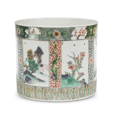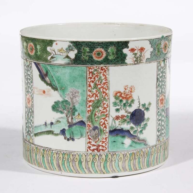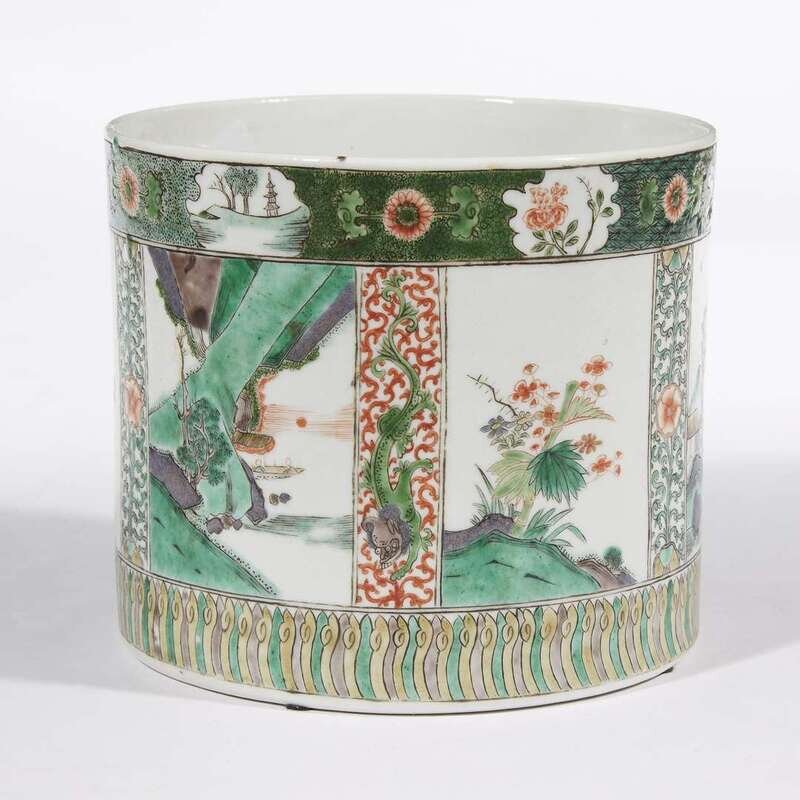 A Kangxi style famille verte-decorated cylindrical brush pot