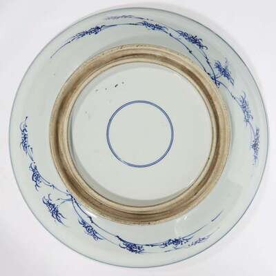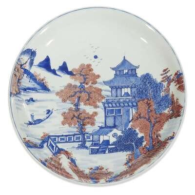 A Chinese underglaze blue and red-decorated porcelain "River Landscape with Pavilion" charger possibly Kangxi period