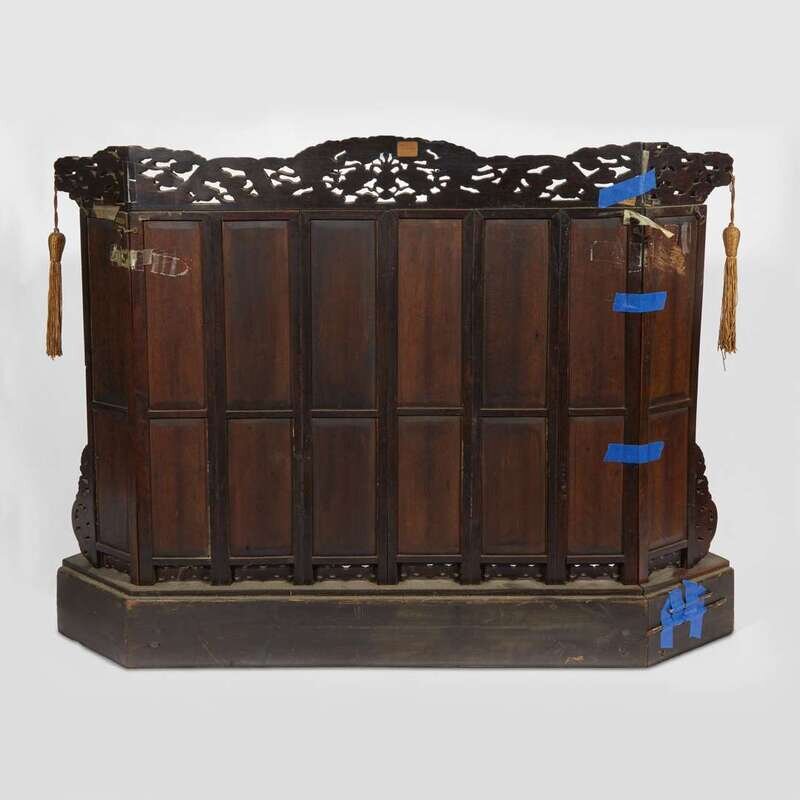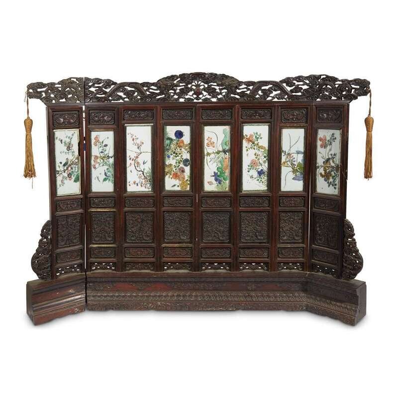 The frame later, carved with bats and chimes among cloud scrolls, each panel with an inset porcelain plaque painted in famille verte enamels with birds and flowers, the cornice of the frame carved with a pair of dragons flanking a flaming pearl, the wood base carved with taotie masks and scrolls.