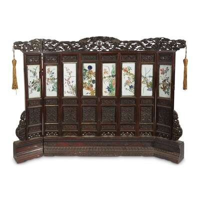 A Chinese eight panel porcelain and carved hardwood table screen The porcelain panels Kangxi period