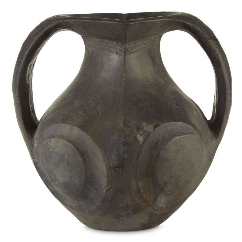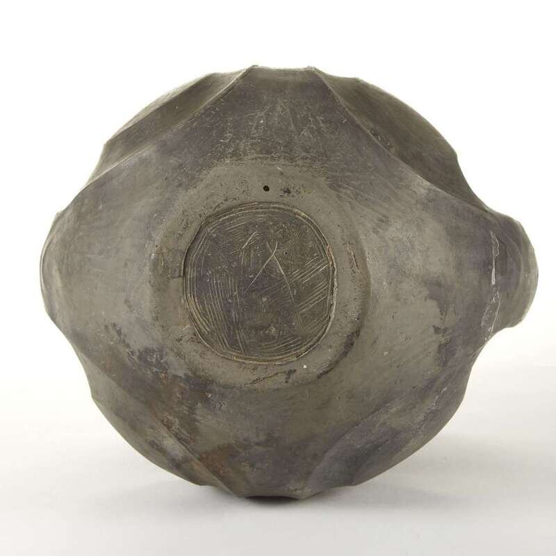 With twin handles and spiral-ornamented sides. Accompanied by a photocopy of the results of Daybreak Archeometric Laboratory Services thermoluminescence test #499A63, dated April 3,1997, stating the results are consistant with the suggested age of manufacture.