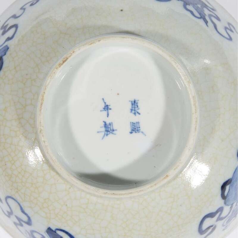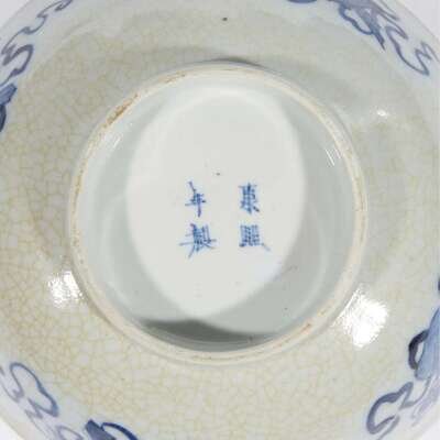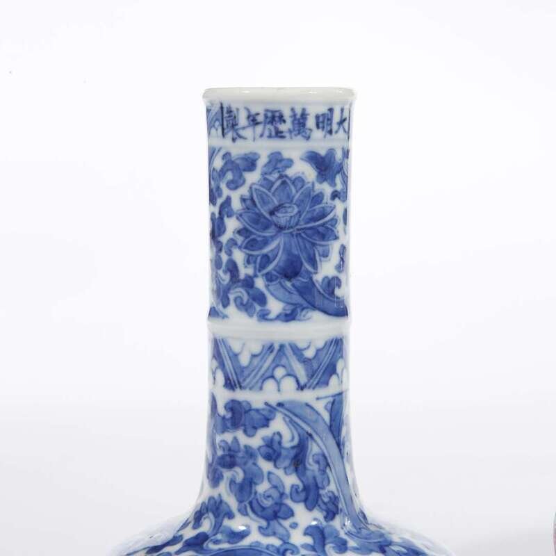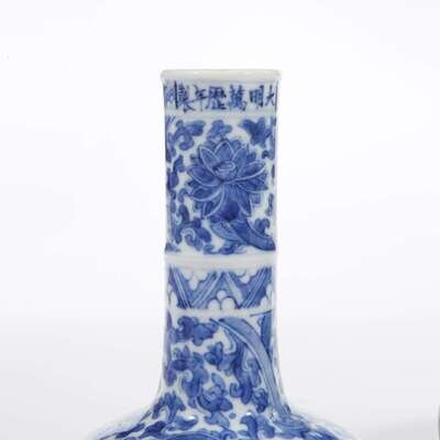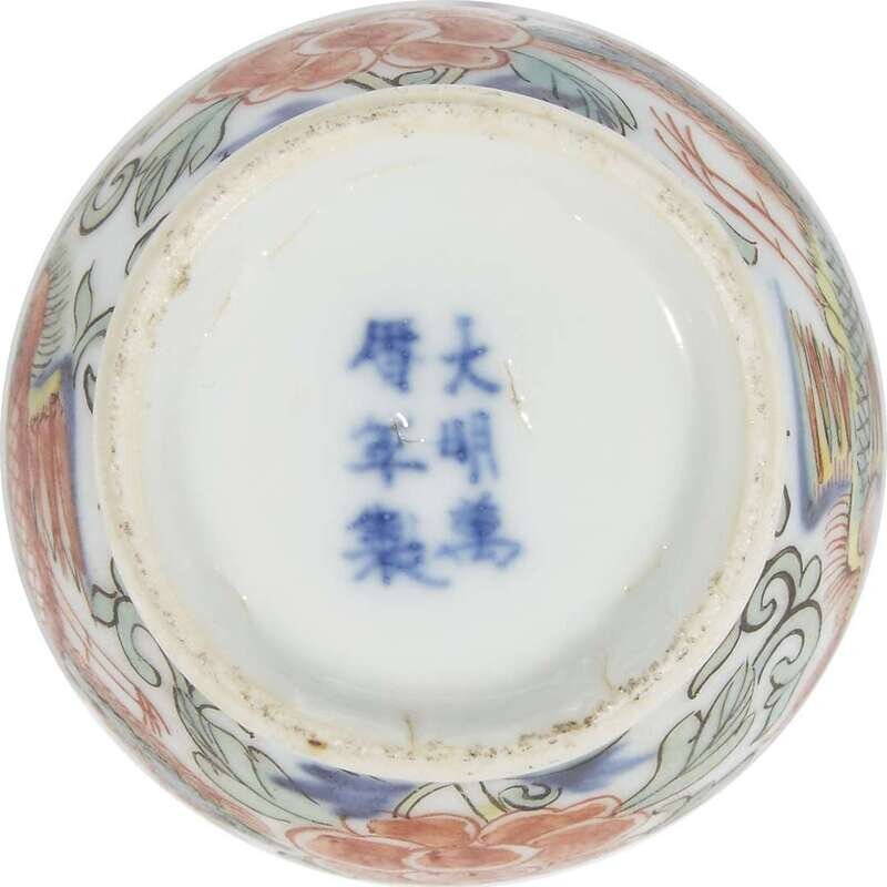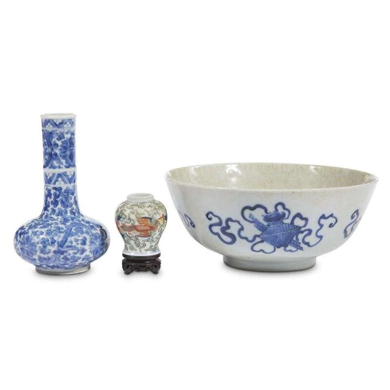 Comprising: a Chinese blue and white "soft-paste" bowl, late 19th century, decorated with Daoist symbols; a small blue and white lotus-scroll decorated vase, Wanli six-character mark, Kangxi period or later, and a miniature wucai-decorated "Phoenix and Peony" jar with apocryphal Wanli mark, wood stand.