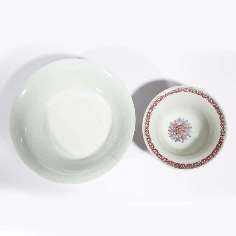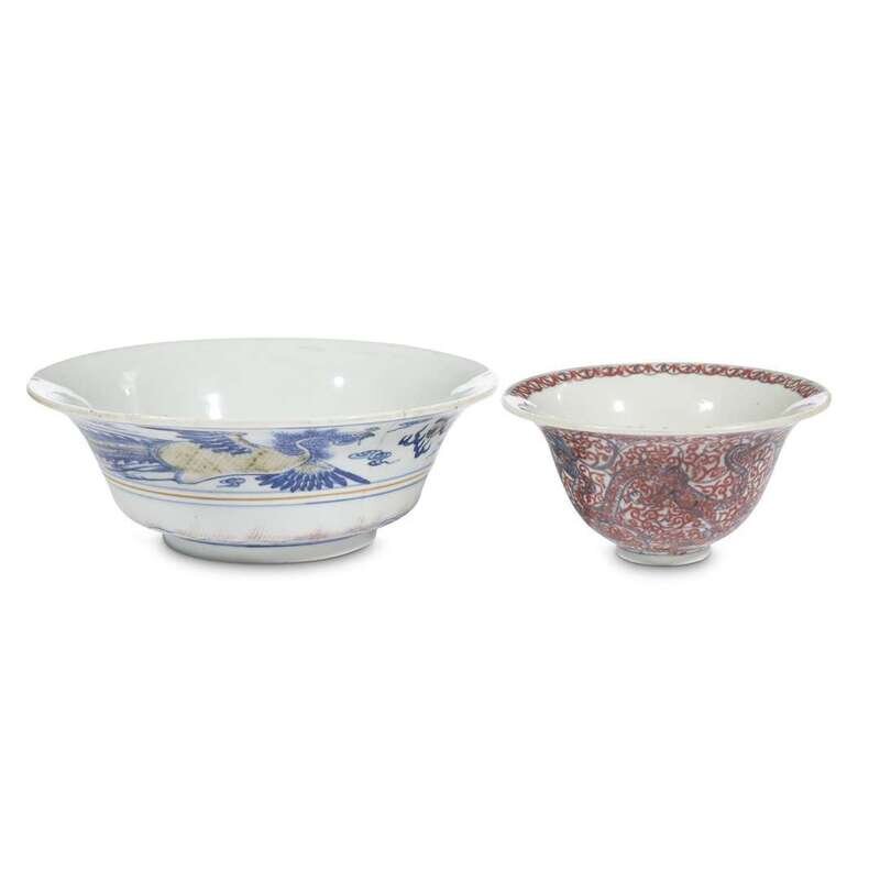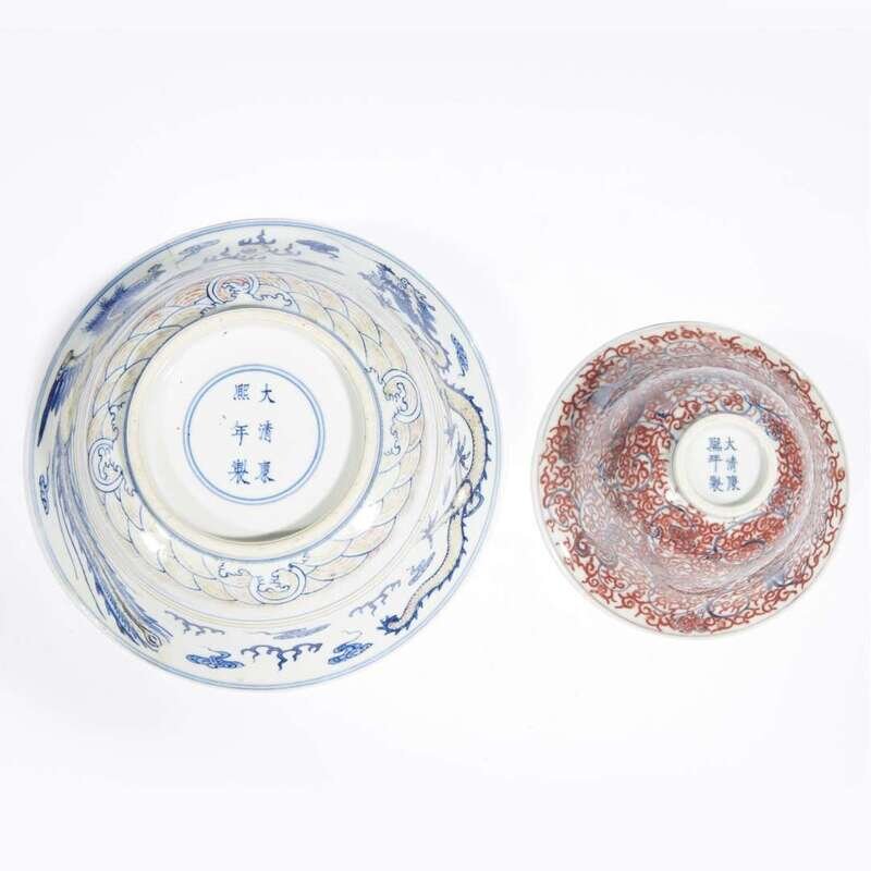 Exterior of larger bowl decorated with phoenix and dragon and scrolling clouds; the smaller of flared circular form, decorated with two dragons among dense scrollwork, interior with a lotus blossom, both inscribed with six-character Kangxi mark.