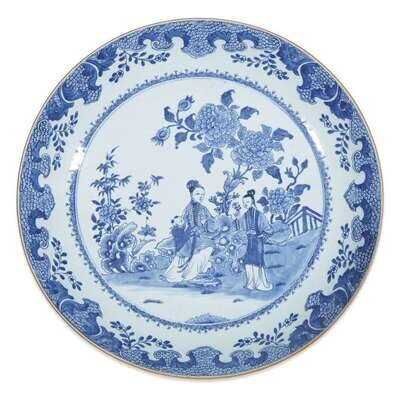 A large Chinese blue and white porcelain figural dished charger circa 1750-65