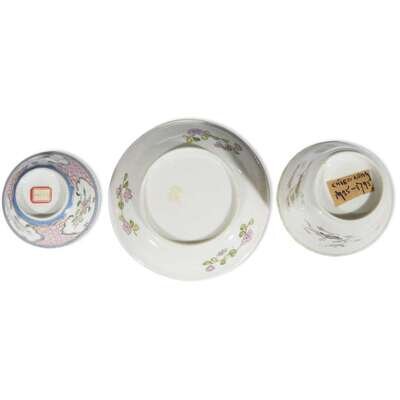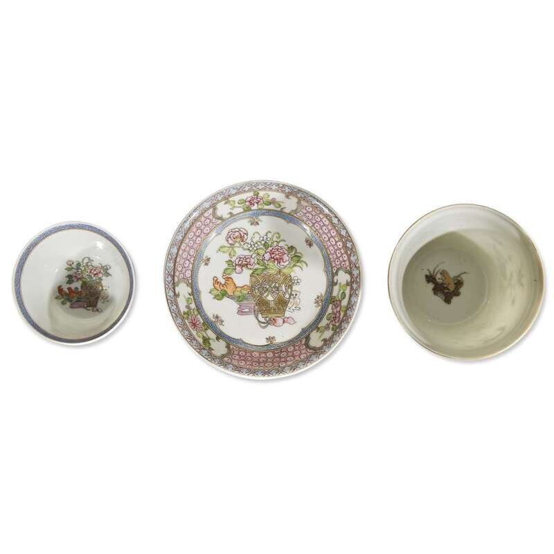 Comprising: A porcelain teabowl and saucer, decorated in flowers and basket; together with a tall teabowl in gold wire with shrimps, crabs, a fan and flowers, interior with a frog on a lotus leaf.
