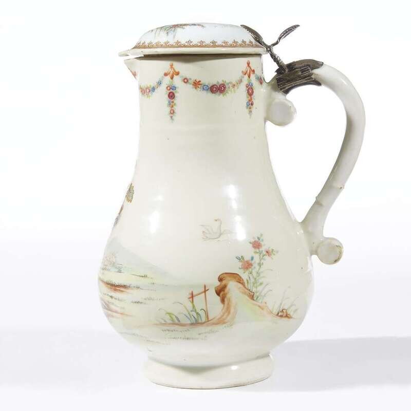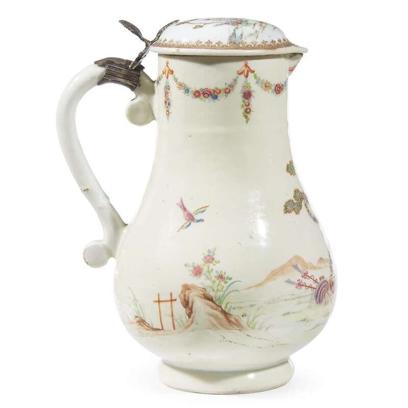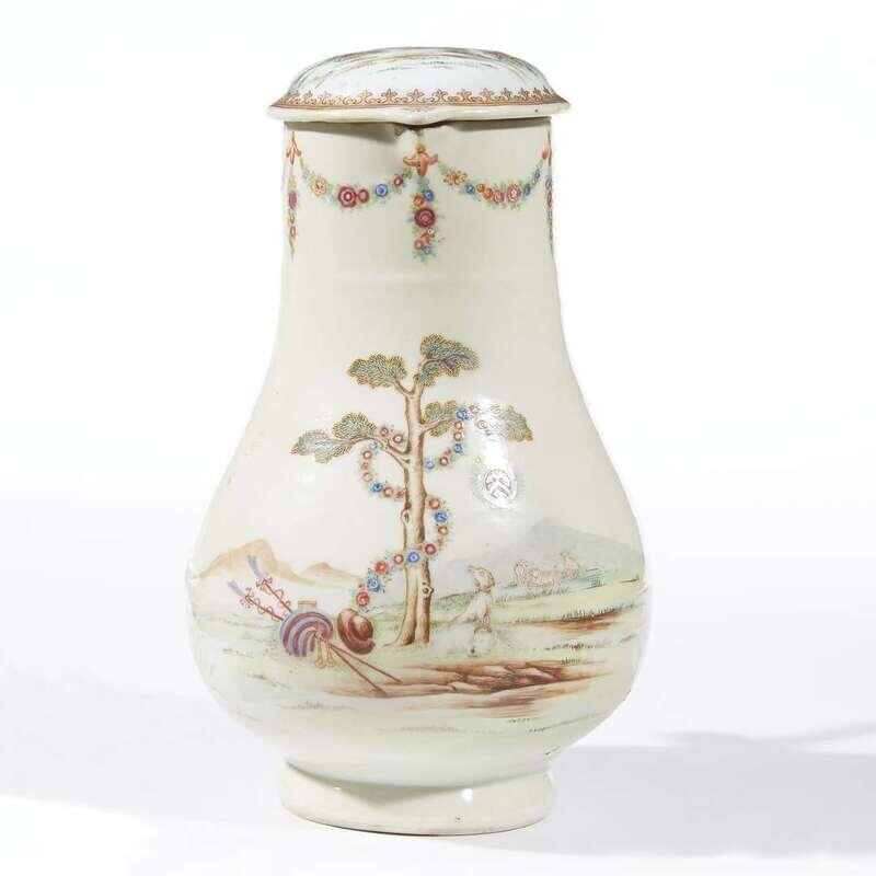 A Chinese famille rose export porcelain coffee pot and hinged cover circa 1745