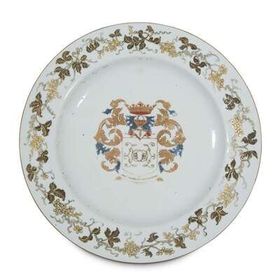 Borders decorated with black and gilt curling grapevines centered by a coronet-crested monogram.