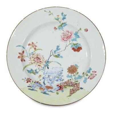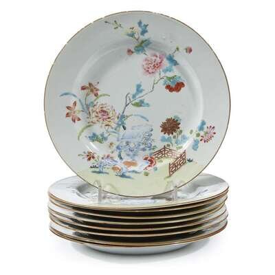 A set of nine Chinese export porcelain famille rose-decorated plates circa 1760