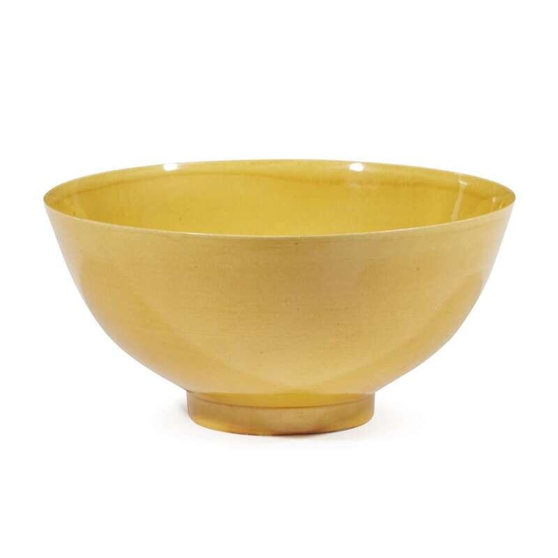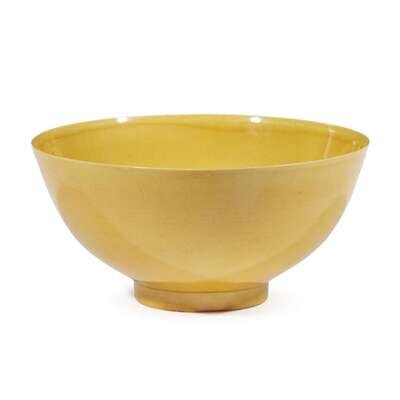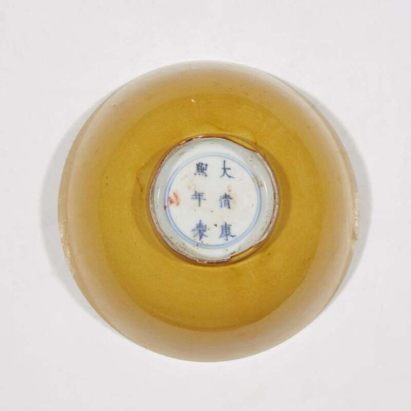 The hemispherical bowl, finely potted, on a straight circular foot, covered with a rich, egg-yolk yellow glaze, with the exception of the white underside with six-character mark in underglaze blue.