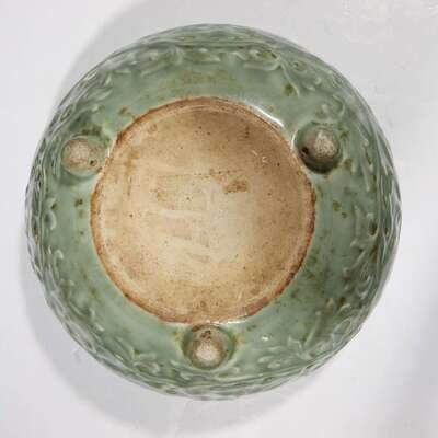 Of compressed hemispherical form with everted lip, raised on three short feet, the exterior carved with peony scrolls, the rim with stylized waves, with later wood stand.