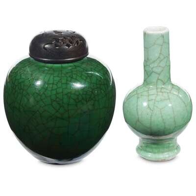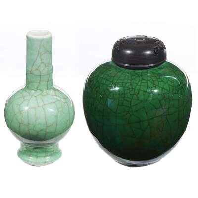 The vase with ringed cylindrical neck and slightly flared foot, globular body, pale green enamel glaze with darker craquelure, the jar with darker iridescent green enamel, dark craquelure, carved wood cover.