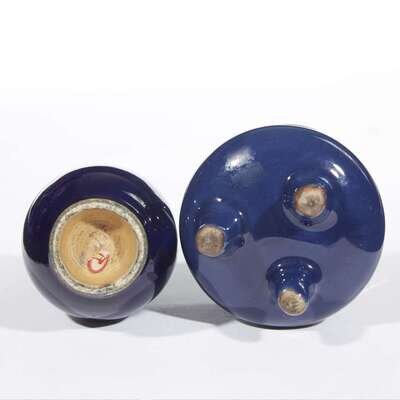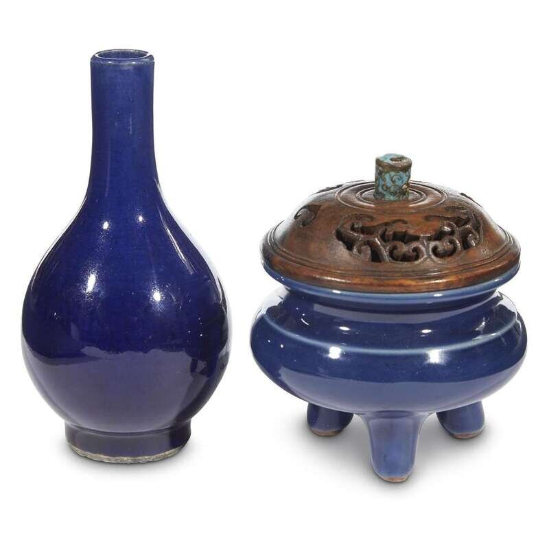 The compressed globular body of the censer stands on three short feet, with a pierced wood cover, cloisonne finial; the bottle vase, possibly 18th century, with tapered ovoid form, slender neck. Both with a deep blue glaze.