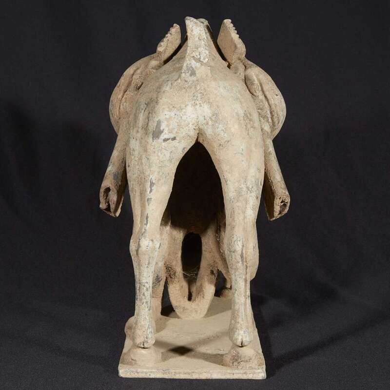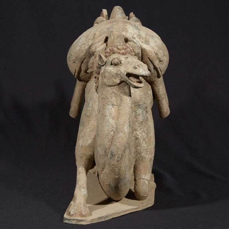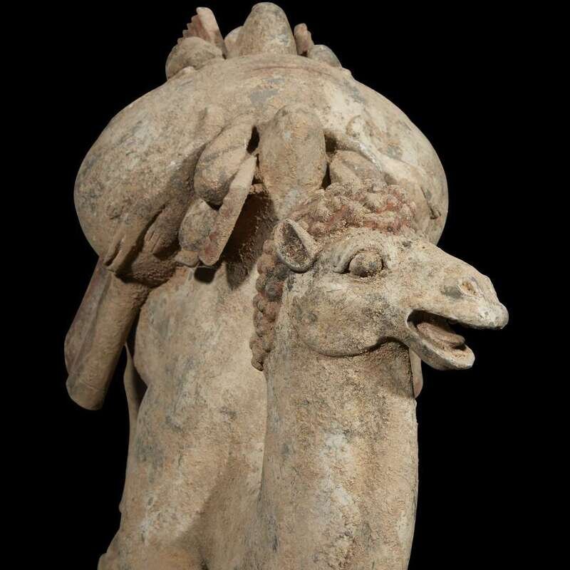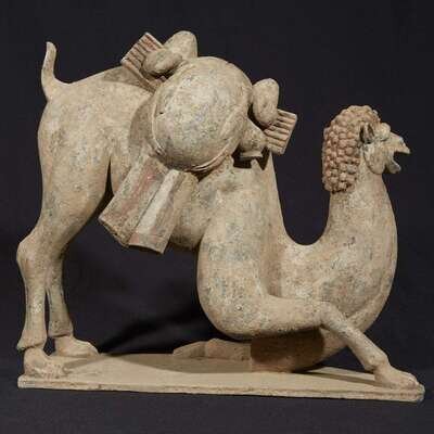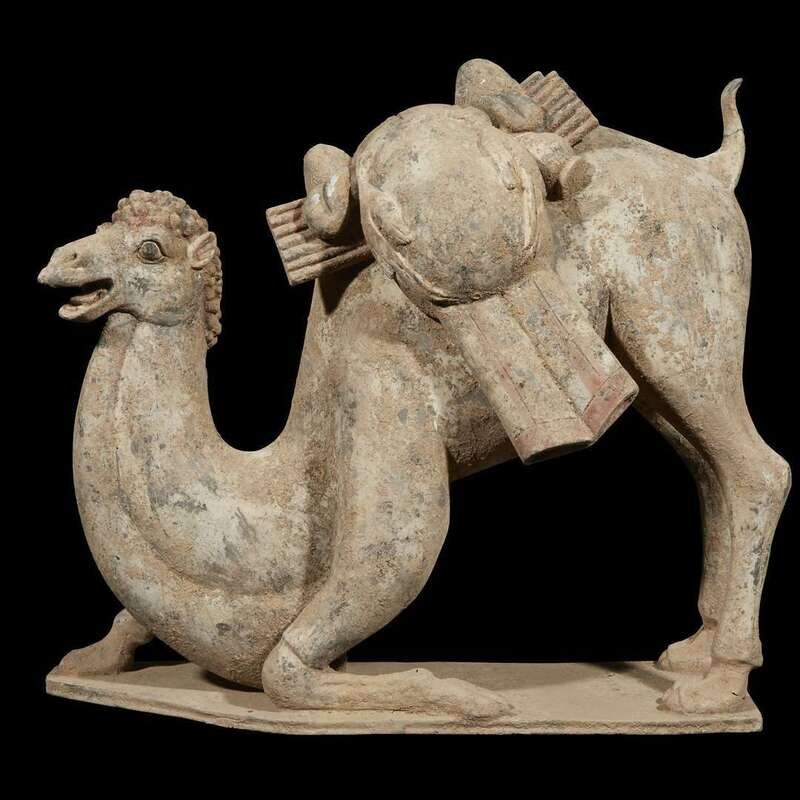 Modelled on a shaped base with one foreleg bent under and the other outstretched, the head with open mouth and appealing expression, slightly turned to one side, covered with a curly mane falling down the curved neck, the back legs still upright below a short curled tail, draped with a delicately painted blanket and bolts of textiles slung between the humps and supported on a wooden frame suspending game and a flask, with finely painted details to the eyes and hair and traces of white and red pigment. Accompanied by the results of Oxford thermoluminescence test #C205g92, dated November 17, 2005, stating that the results are consistant with the suggested period of manufacture.