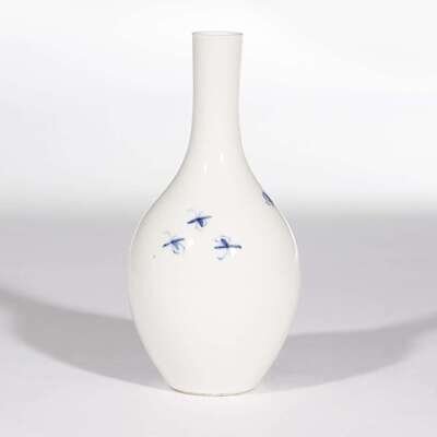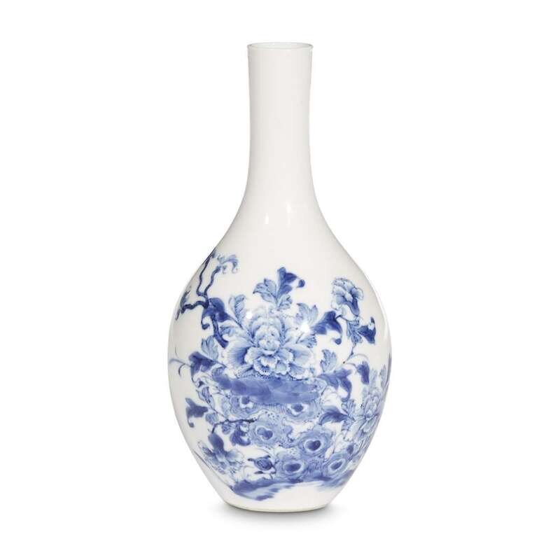 Of tapered ovoid form vase with long neck, finely-decorated with peonies among rockwork and three insects.