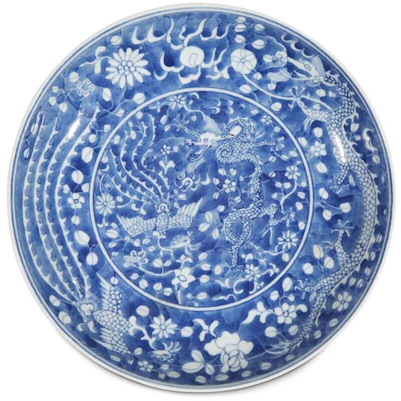 decorated with confronting sinuous dragon and phoenix against a blue ground; dragon and phoenix border to cavetto and underside of cavetto.