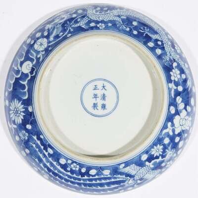 A Chinese blue and white "Dragons and Phoenix" dish Yongzheng six-character mark and possibly of the period