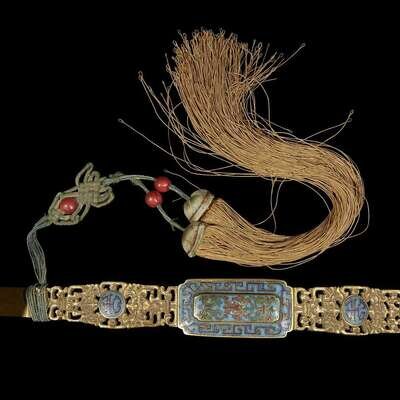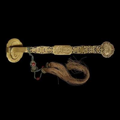 The shaped head with central cloisonne panel depicting a descending bat, within a scroll border, the scroll and bat-pierced shaft and base, centered by panels depicting Indian lotus and shou symbols, the reverse carved with additional auspiscious symbols, associated silk tassels.